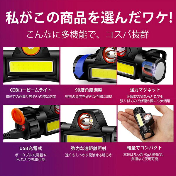 【ポイント10倍】ヘッドライト 充電式 釣り led cob 軽量 長時間 防水 ヘッドバンド式/ハンドライト LED懐中電灯 キャンプ/ 登山/工事/作業用 ヘルメット/防災 アウトドア 小型